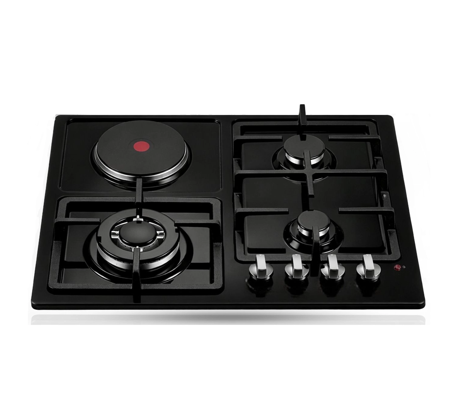 Конфигурация предусматривает несколько конфорок, включая газовые и одну электрическую, что дает возможность одновременно использовать разные источники нагрева. Газовые конфорки подходят для быстрого и интенсивного приготовления, а электрическая зона — для более деликатных процессов или как альтернатива при необходимости.
